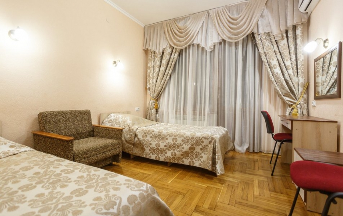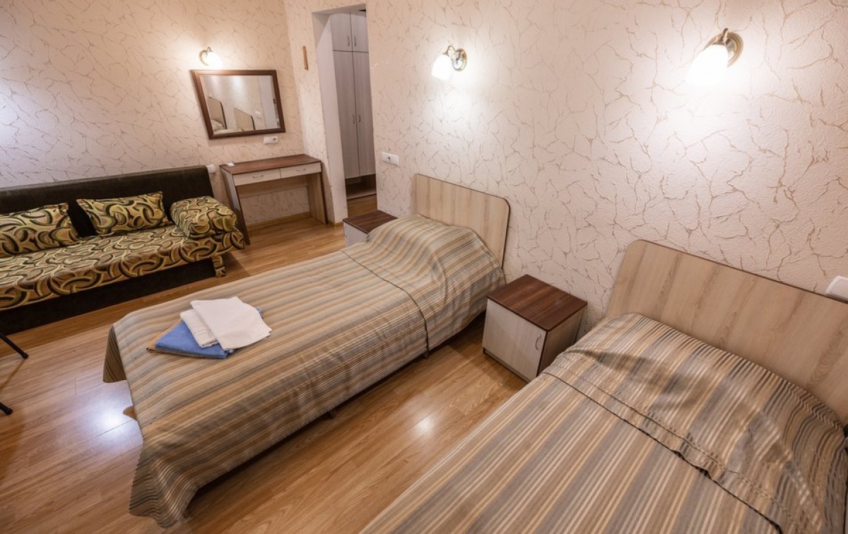 Трехкомнатный Люкс с видом на гору Ай-Петри. В номере двуспальная или две односпальные кровати, мягкая мебель (раскладные диваны, кресла), телевизор, холодильник, кондиционер, фен, утюг, гладильная доска.