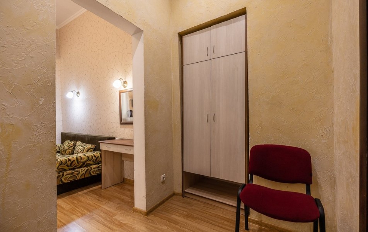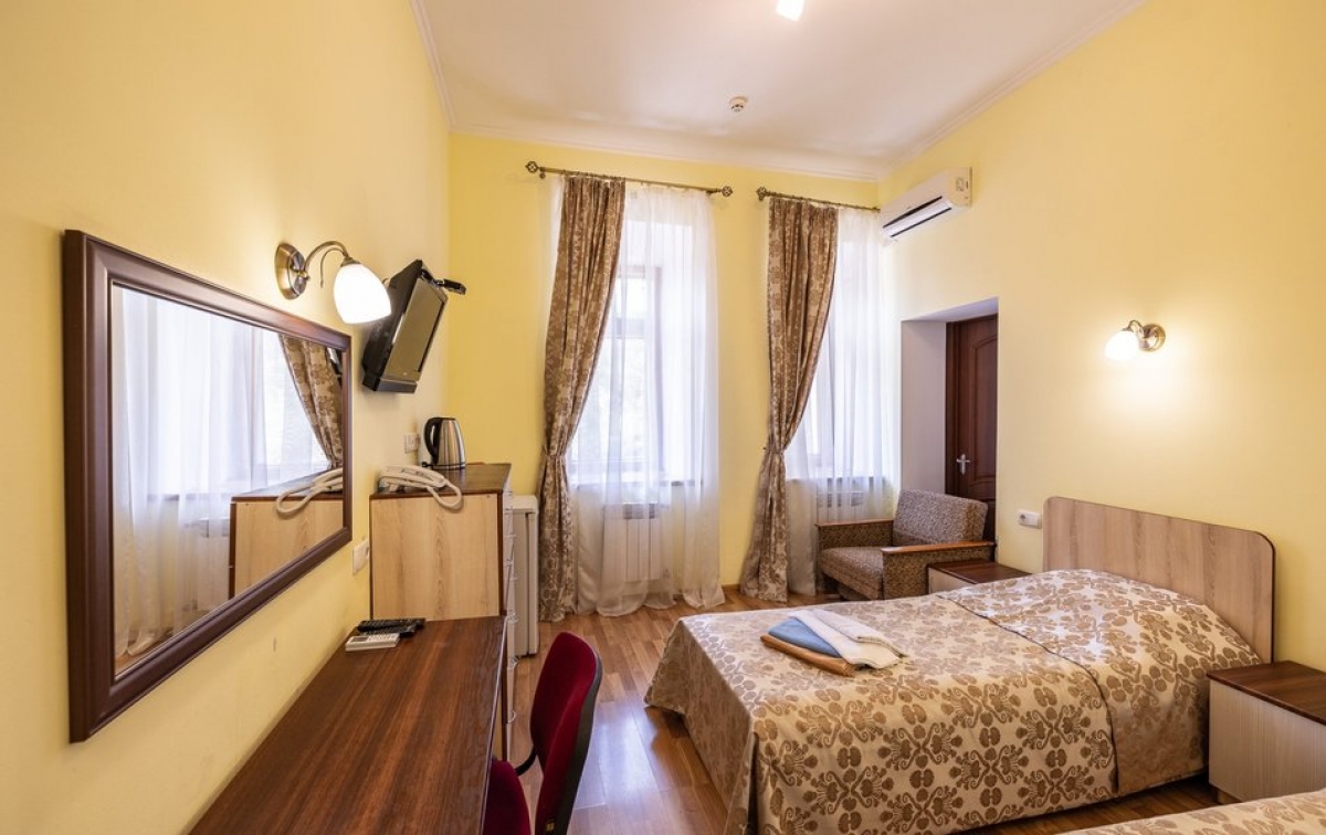 Двухместный стандартный номер с видом на гору Ай-Петри. В номере одна односпальная кровать, набор гостиничной мебели: тумбочка, шкаф, стол, стул, санузел, душ, полотенцесушитель, телевизор, холодильник, кондиционер.