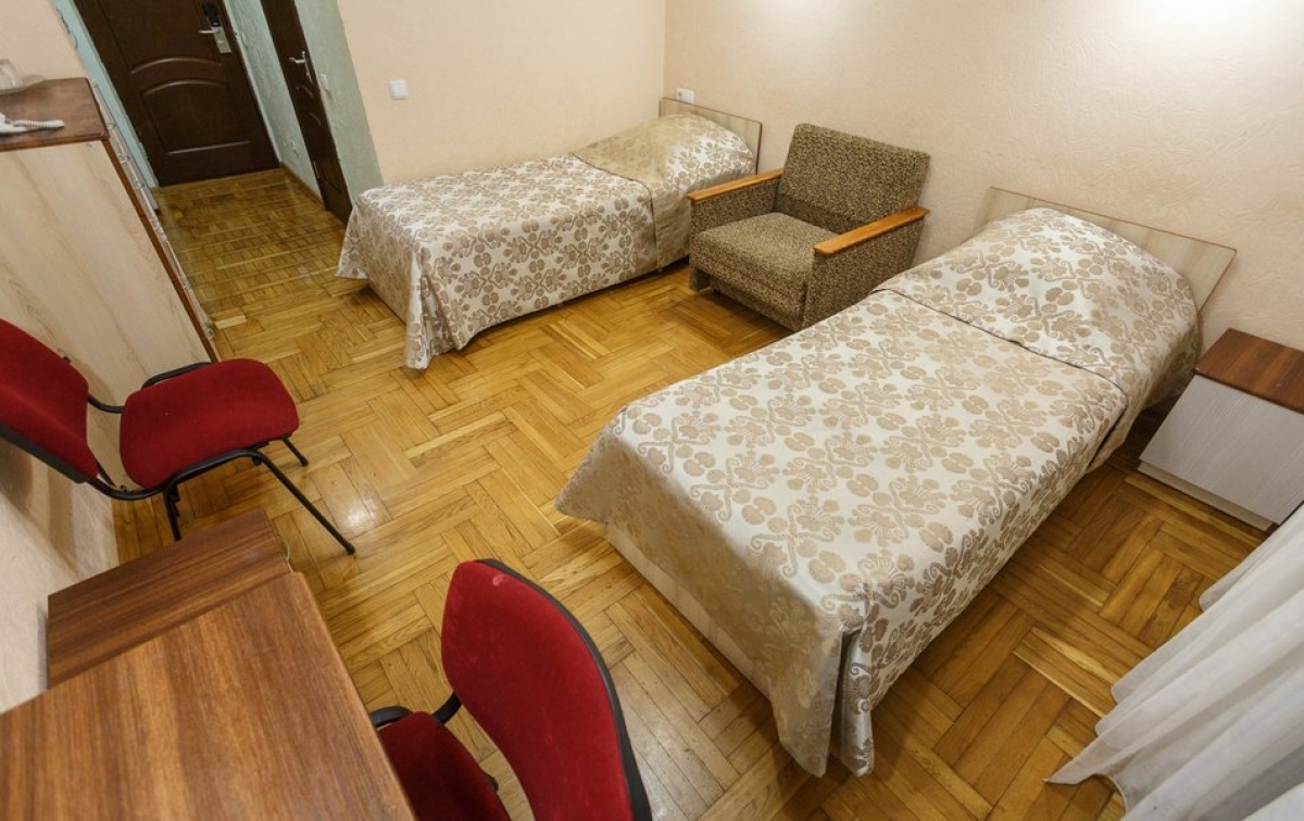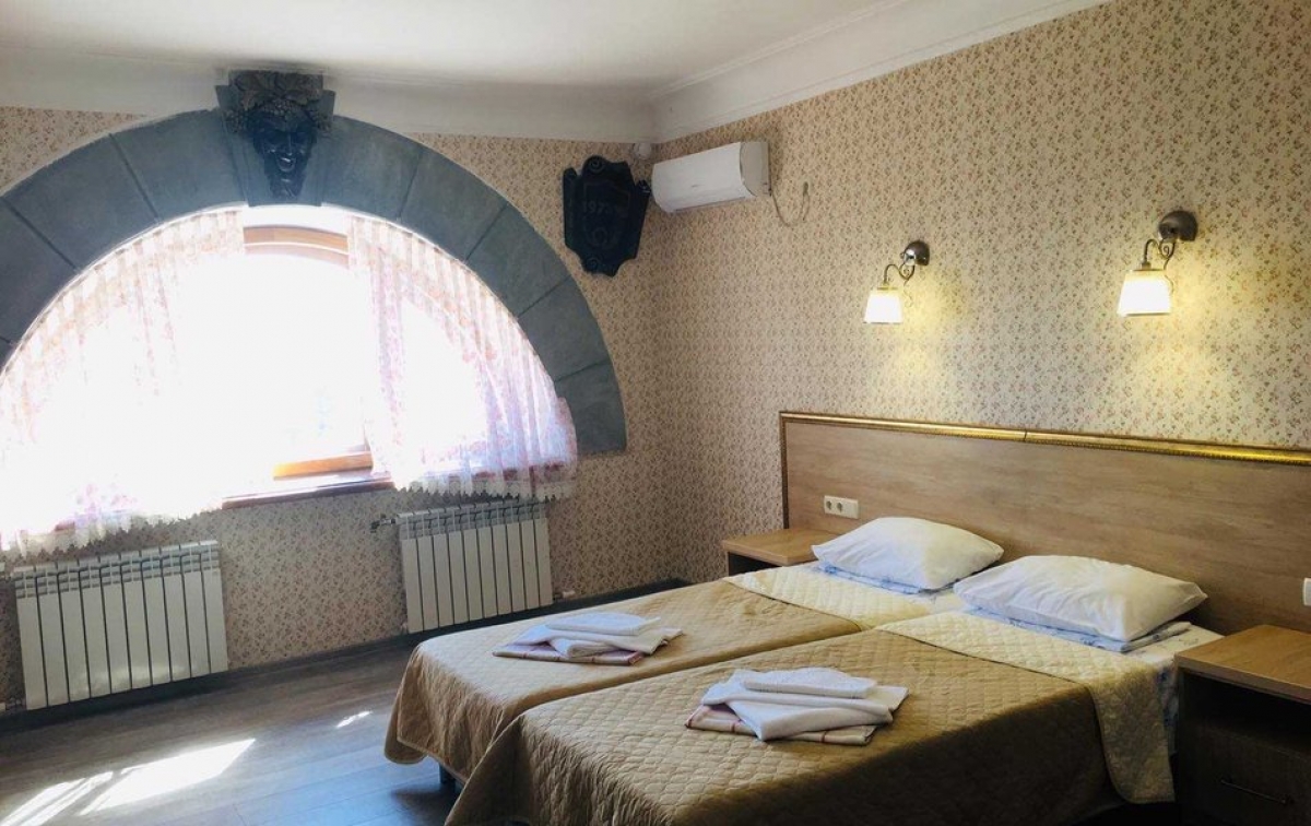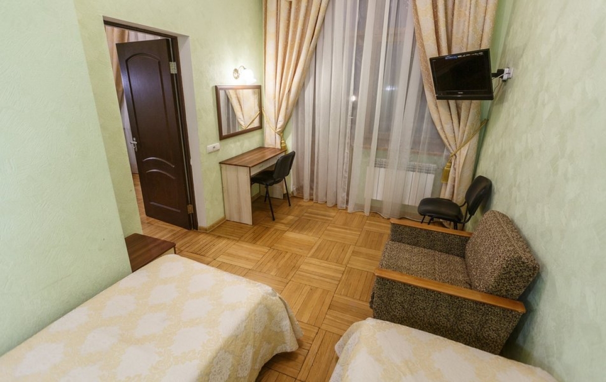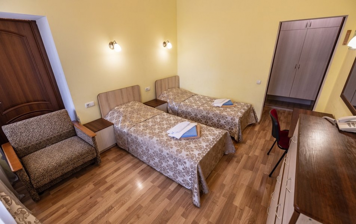 Однокомнатный номер эконом без балкона с видом на гору Ай-Петр). В номере две односпальные кровати, гостиничная мебель (тумбочки, шкаф, стол, стулья), санузел и ванная комната совмещённые, есть кабельное телевидение, холодильник, кондиционер.