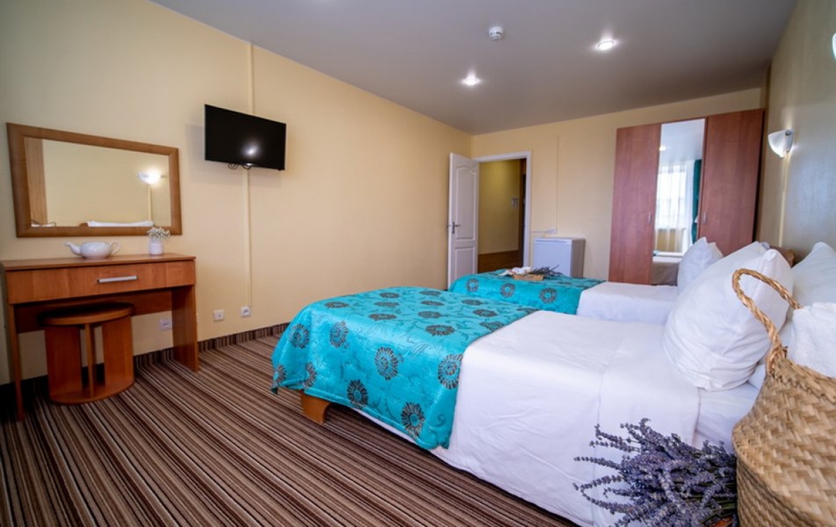 Двухкомнатный четырехместный номер люкс, площадью 40 м.кв. В номере двуспальная кровать или две раздельные кровати и раскладной диван, прикроватные тумбочки, шкаф для одежды, телевизор, холодильник, кондиционер, чайный набор, сейф, телефон. Ванная комната (душ, умывальник, туалет, фен, набор полотенец, косметические средства, тапочки, халат). Номер без балкона. Дополнительное место - еврораскладушка. Максимальное размещение - 5 человек.